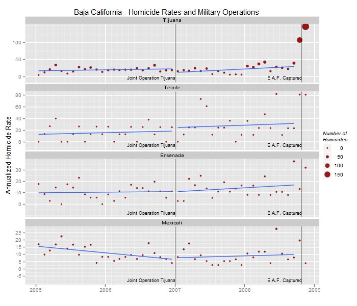 Given there wasn’t a spike in the murder rates there was hardly any reason to send in the army in 2007. If you look closely there was an increase in the homicide rate in Tijuana during 2008, but the scary stuff didn’t start until the end of the year.
