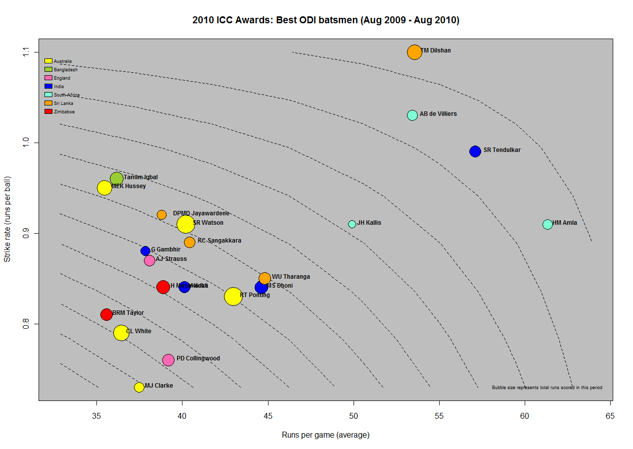 Recently ICC awards 2010 were announced and I began wondering how the process works. I haven’t seen any good documentation of the process, so I started thinking how would I do it. Here’s my version. Thoughts?Want to share your content on R-bloggers? click here if you have a blog, or here if you don't.