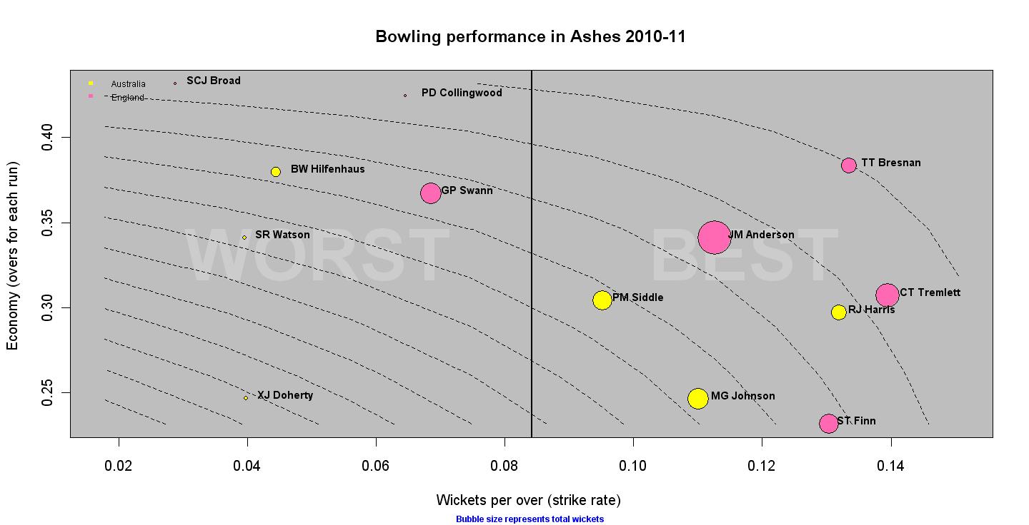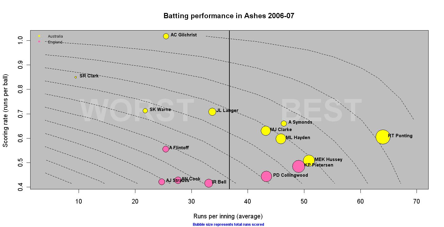 Compare 2010-11 Ashes series with England’s previous Ashes tour to Australia in 2006-07. In 2010-11, English cricketers (pink) dominated the top-right corners of batting/bowling performance charts, whereas in 2006-07 Australia (yellow) dominated the top-right section of these charts.