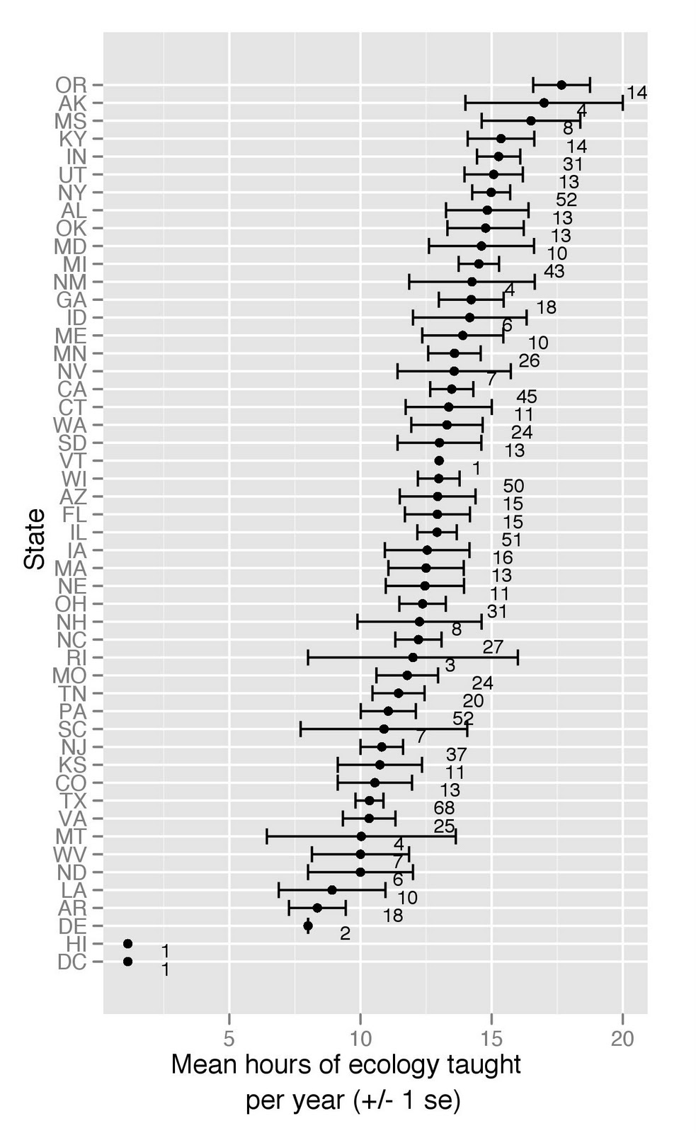 labs(x = "State", y = "Mean hours of ecology taught n per year (+/- 1 se)")