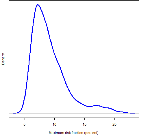 We get a different picture if we look at the maximum risk fraction in each portfolio rather than all of the risk fractions. Figure 3 shows that most portfolios have a fairly high maximum risk fraction — 5 out of the 1000 portfolios had a risk fraction over 20%.