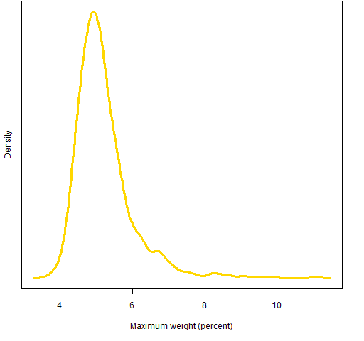 We can do the same sort of analysis on weights as on risk fractions. Figure 4 shows the distributions of all weights, and Figure 5 shows the distribution of maximum weights.