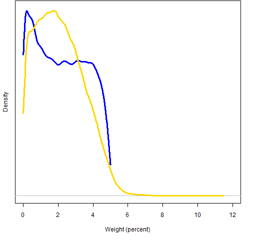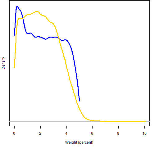 Figure 4: 2008 Q3 distribution of all weights when weight is constrained (blue line) and risk fraction is constrained (gold line).