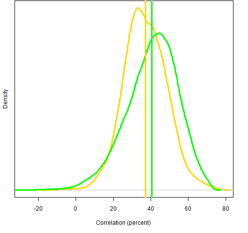 Figure 3: Densities of the correlations from the Ledoit-Wolf estimate (gold) and the factor model (green). The vertical lines are the means.