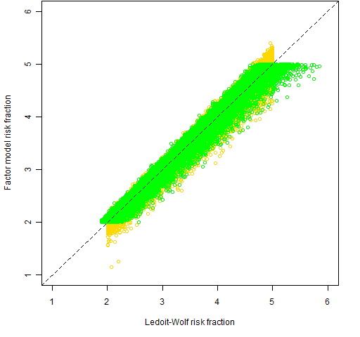 We’ve generated a set of random portfolios with constraints on the risk fractions of a Ledoit-Wolf variance matrix, and a corresponding set of random portfolios with risk fraction constraints from a statistical factor model. The two variance matrices use data up to the end of 2008 Q3. See posts: