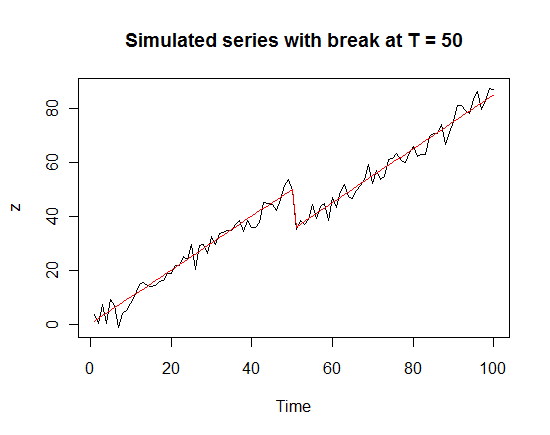dummy <- as.numeric(ifelse(t <= 50, 0, 1)) # specifying the dummy for trend break at T = 50