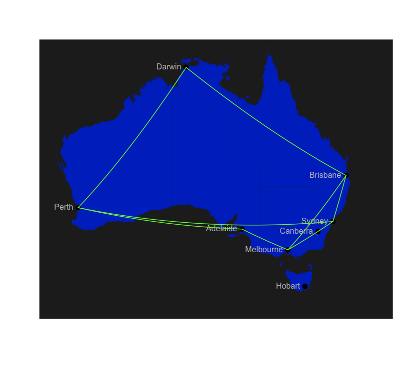 | Figure 1: Map of Australia’s state capitals. Connections have been selected arbitrarily for illustrative purposes. |