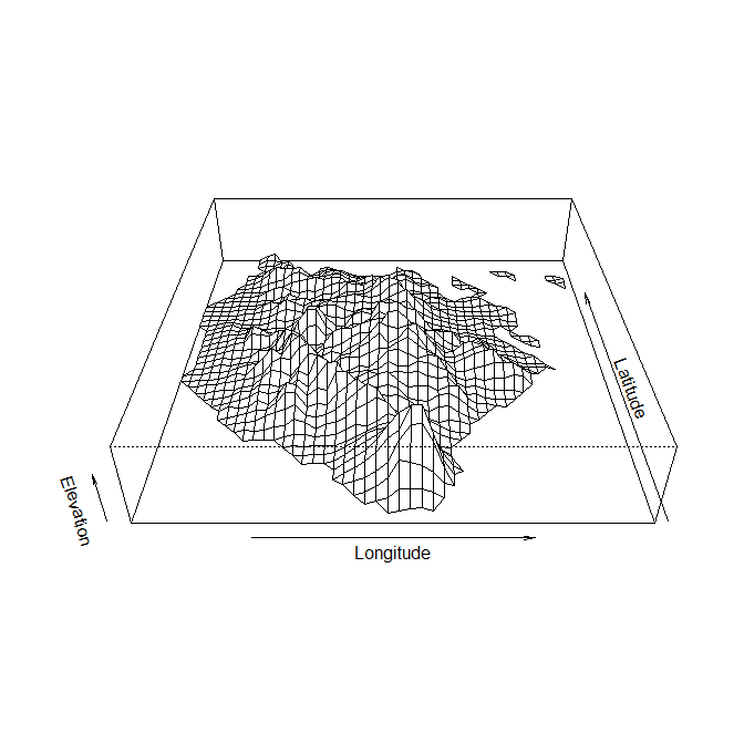 persp(maralt, exp=0.2,phi=35, xlab=”Longitude”, ylab=”Latitude”, zlab=”Elevation”)