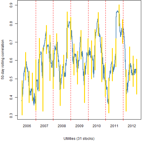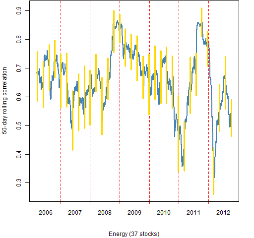 Figure 1 shows the 50-day rolling mean correlation among the stocks. The vertical lines show 95% bootstrap confidence intervals where the bootstrapping is over the days. (Variability from assets is quite small.) The bootstrapping is done every 50 trading days, so each confidence interval uses different data.