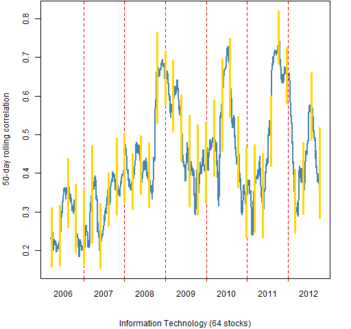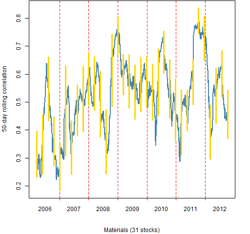 The remainder of the figures show the 50-day rolling mean correlations of the stocks within sectors.
