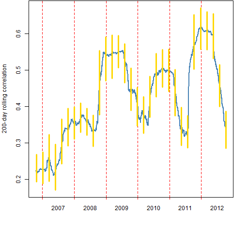 Figure 2 shows the 200-day rolling correlations. The confidence intervals are computed every 50 days, so only every 4th confidence interval uses non-overlapping data.