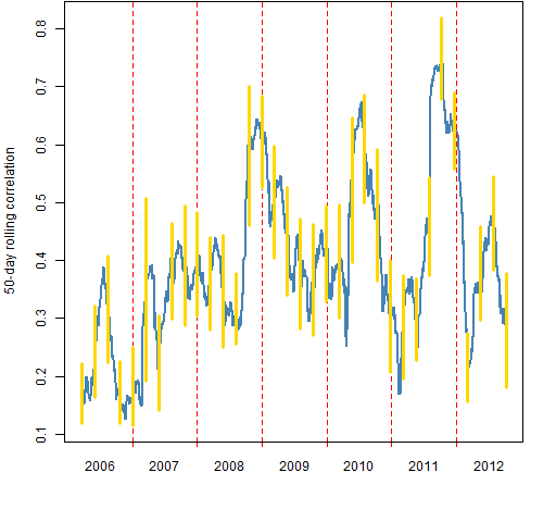 Note that this function is not fully abstract. It presumes that the window for computing correlations is 50 days. It also fails to include the three-dots construct into the call to pp.timeplot (as intended).