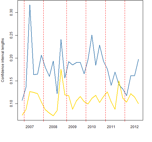 Figure 3: Confidence interval lengths: 50-day (blue), 200-day (gold).