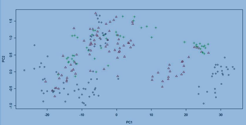 I have imported the test set into R, and I did project the test set into the PC1-PC2 score map (developed with the calibration samples), and I found another cluster. < o:p>
