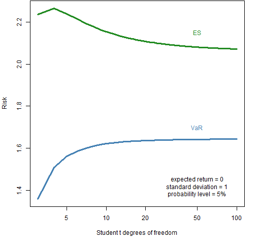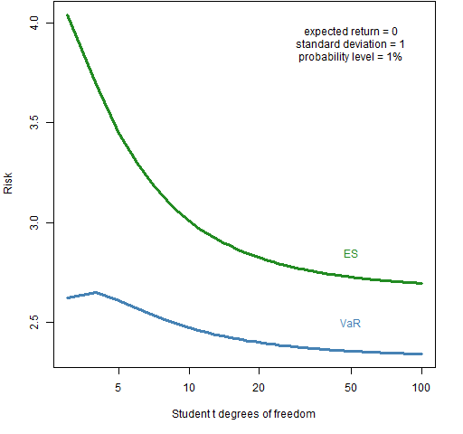 The VaR for 3 degrees of freedom is smaller than that for 4 degrees of freedom, but otherwise the plot is as we would hope — more risk means more VaR. Figure 2 adds Expected Shortfall to the picture.