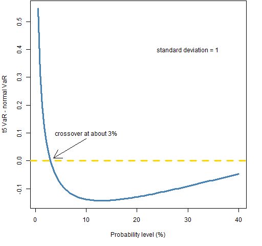 There is an irony that the normal distribution is a conservative assumption for Value at Risk with 5% probability.