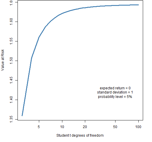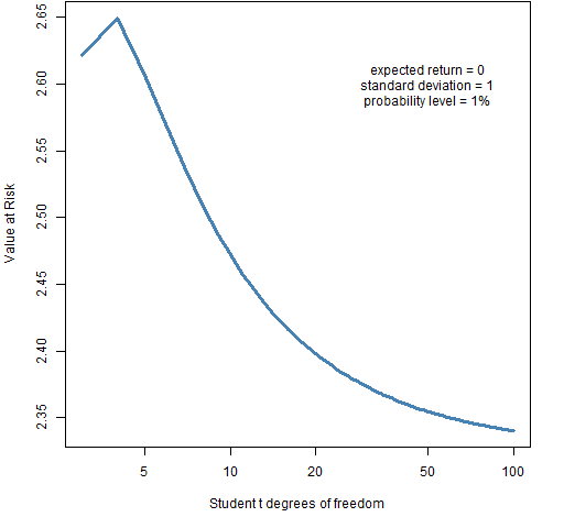 Figure 1: Value at Risk with varying degrees of freedom of the t distribution for probability 1%.