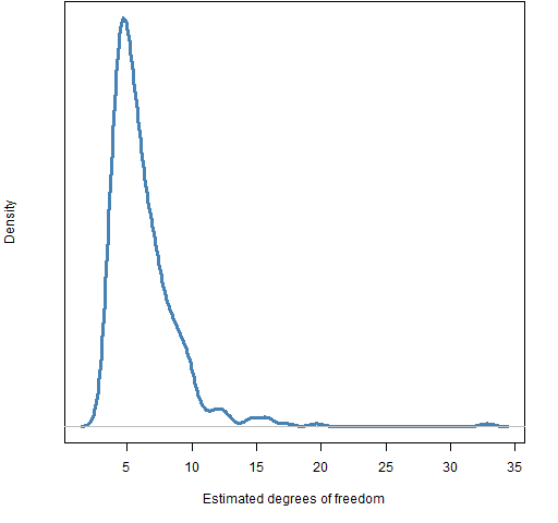 The estimated degrees of freedom for the stocks is shown in Figure 1. Estimation failed for one stock.