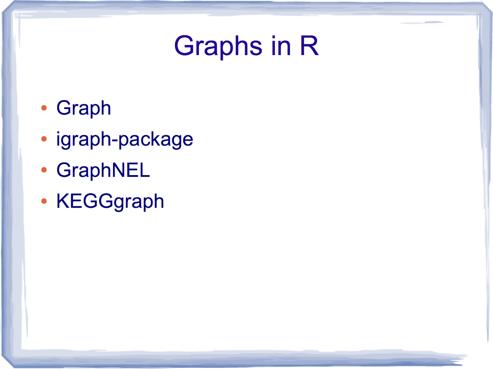 igraph, maintained by Gabor Csardi. Although different packages use sometimes different graph objects, there are often conversation tools available, e.g. igraph.to.graphNEL, allowing users to use the best algorithms from all packages.You can access Afshin’s slides via our Meetup site.