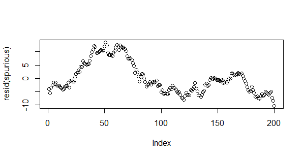 > summary(spurious) Call: lm(formula = rwalk1.ts ~ rwalk2.ts) Residuals: Min 1Q Median 3Q Max -10.341 -4.495 -1.508 2.602 13.488 Coefficients: Estimate Std. Error t value Pr(>|t|) (Intercept) 3.79154 1.15145 3.293 0.00117 ** rwalk2.ts -0.31904 0.06928 -4.605 7.36e-06 *** --- Signif. codes: 0 ‘***’ 0.001 ‘**’ 0.01 ‘*’ 0.05 ‘.’ 0.1 ‘ ’ 1 Residual standard error: 5.87 on 198 degrees of freedom Multiple R-squared: 0.09675, Adjusted R-squared: 0.09219 F-statistic: 21.21 on 1 and 198 DF, p-value: 7.363e-06