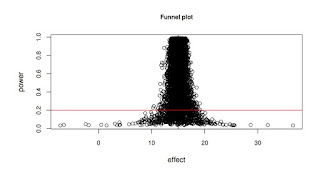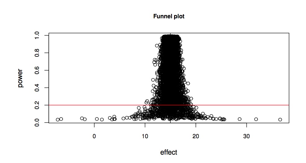 What we see here is repeated samples from a Normal distribution with true mean 15 and a typical standard deviation seen in psycholinguistic studies (see slide 42 of my slides for lecture2). The horizontal red line marks the 20% power line; most psycholinguistic studies fall below that line in terms of power. The dramatic consequence of this low power is the hugely exaggerated effects (which tend to get published in major journals because they also have low p-values) and the remarkable proportion of cases where the sample mean is on the wrong side of the true value 15. So, you are roughly equally likely to get a significant effect with a sample mean smaller to much smaller than the true mean, or larger and much larger than the true mean. With low power, regardless of whether you get a significant result or not, if power is low, and it is in most studies I see in journals, you are just farting in a puddle.