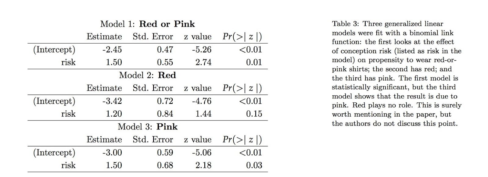 that their confidence intervals are huge (this is probably why they report standard errors, it wouldn’t look so impressive if they had reported CIs). All they needed to show to make their point was to get the p-value below 0.05. The practical relevance of a 12 picogram/ml increase in testosterone is left unaddressed. Another recent example from Psychological Science, which seems to publish studies that might attract attention in the popular press, is this study on how ovulating women wear red. This study is a follow up on the notorious Psychological Science study by Beall and Tracy. In my opinion, the Beall and Tracy study reports a bogus result because they claim that women wear red or pink when ovulating, but when I reanalyzed their data I found that the effect was driven by pink alone. Here is my GLM fit for red or pink, red only and pink only. You can see that the “statistically significant” effect is driven entirely by pink, making the title of their paper (Women Are More Likely to Wear Red or Pink at Peak Fertility) true only if you allow the exclusive-or reading of the disjunction: