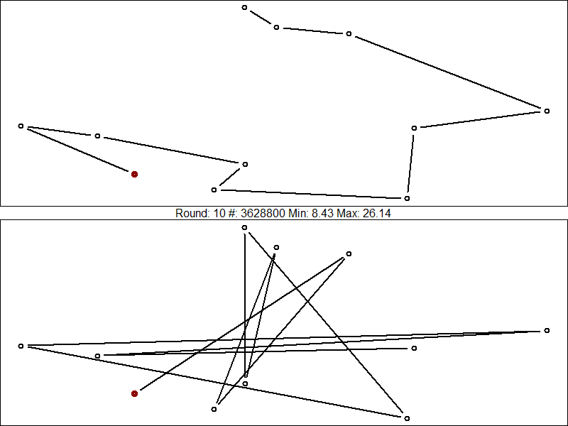 | Two solutions for a 10 maiden problem. Top is shortest route while bottom is longest. |
