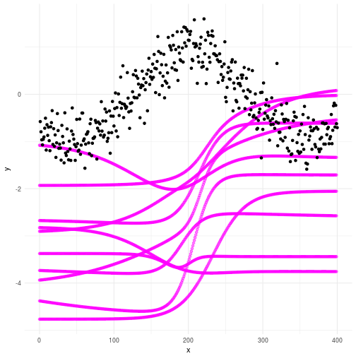 If you ran the code you will now have two files called mydfprior.csv and mydfpost.csv which contains, surprise, surprise, your prior and posterior curves based on the samples. As always we plot out the consequence of our priors and check what happens. In the plot below you can see that our priors for the Bayesian Neural Network do not really produce curves that resembles what we’re looking for. Not to worry my friends; we don’t actually need them to. Look through the graph and make sure you understand why the plot looks the way it does.