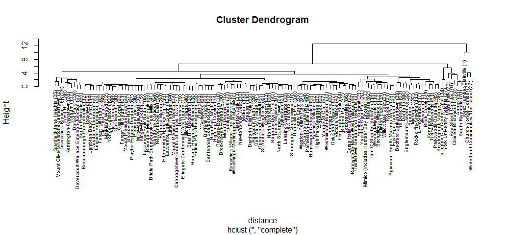 If we choose any height along the y-axis of the dendrogram, and move across the dendrogram counting the number of lines that we cross, each line represents a cluster. For example, if we look at a height of 10, and move across the x-axis at that height, we’ll cross two lines. That defines a two-cluster solution; by following the line down through all its branches, we can see the names of the neighbourhoods that are included in these two clusters. Looking at the dendrogram for the Toronto’s crimes data, we can see our datapoins are very imbalanced. From the top of the tree, there are two distinct groups; one group consists of brunches with brunches and more brunches, while another group only consists few neighbourhoods, and we can see these neighbourhoods are Toronto’s most dangerous neighbourhoods. However, I want to try many different groupings at once to start investigating.