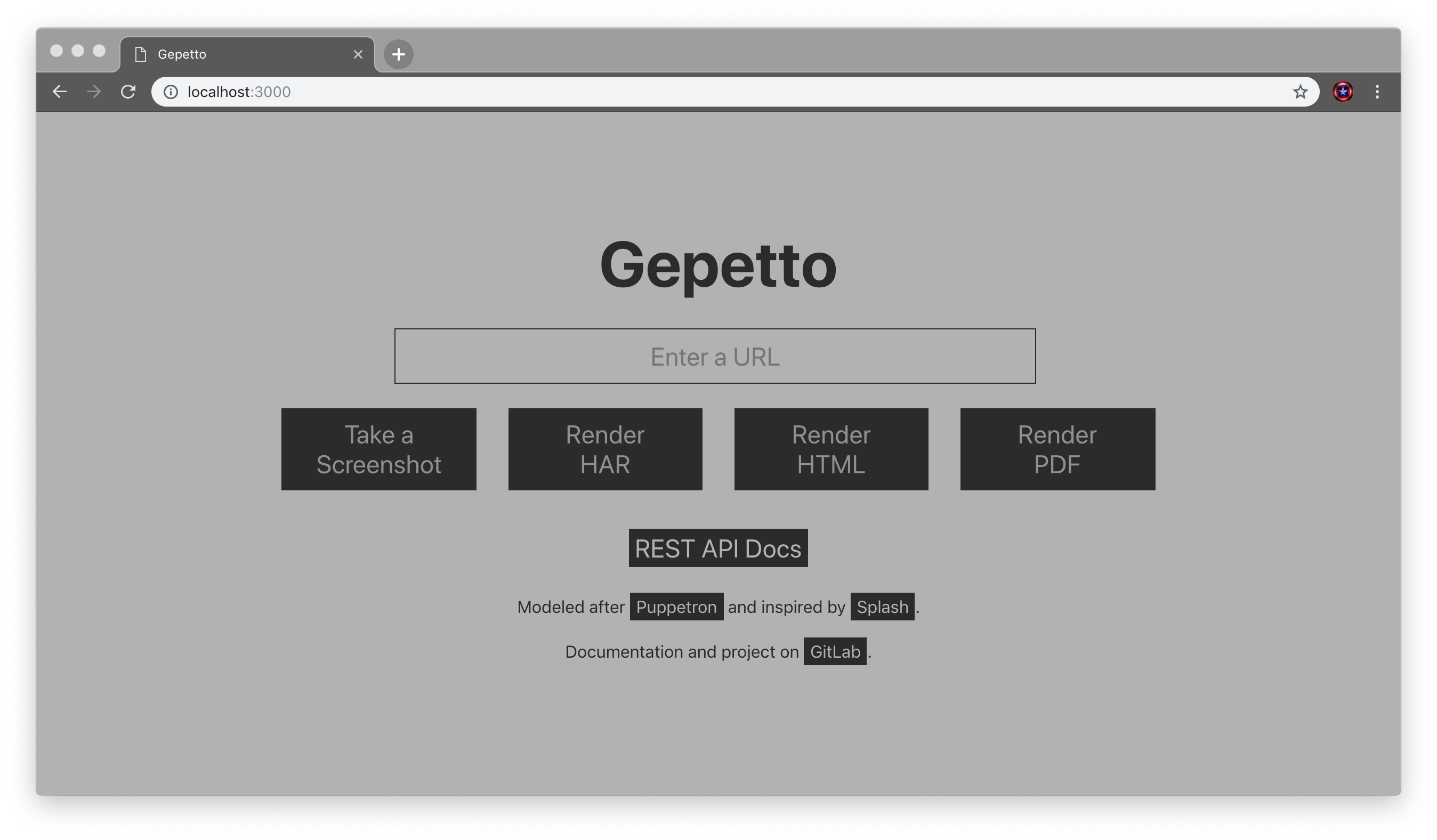 Gepetto is a Node.js application which uses puppeteer for all the hard work. After seeing that such a REST API interface was possible via the puppetron proof of concept I set out to build a framework which will (eventually) provide the same feature set that Splash has, substituting puppeteer-fueled javascript for the Lua interface.