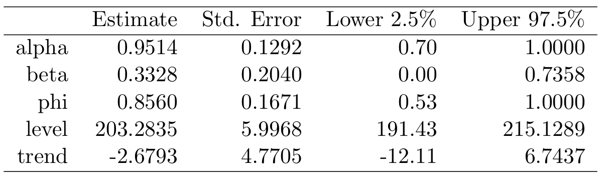 As you can see in the output above, the function generates the confidence intervals for the parameters of the model, including the smoothing parameters, dampening parameter and the initial states. This summary can then be used to generate the LaTeX code for the main part of the table: