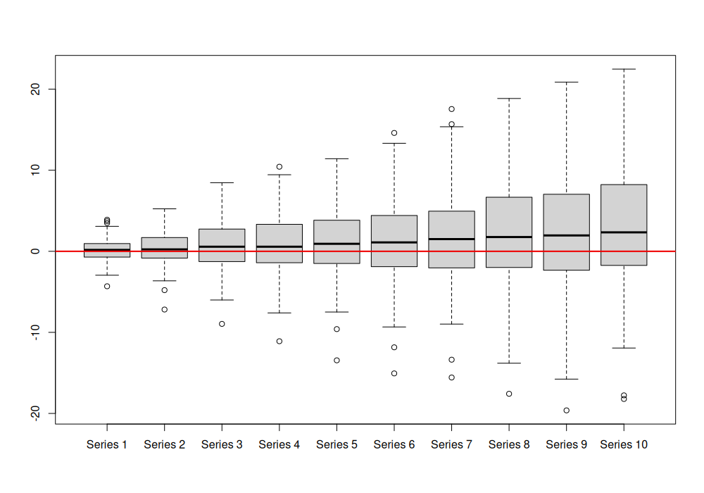 rmultistep(adamETSBJ, h=10) |> boxplot() abline(h=0, col="red2", lwd=2)