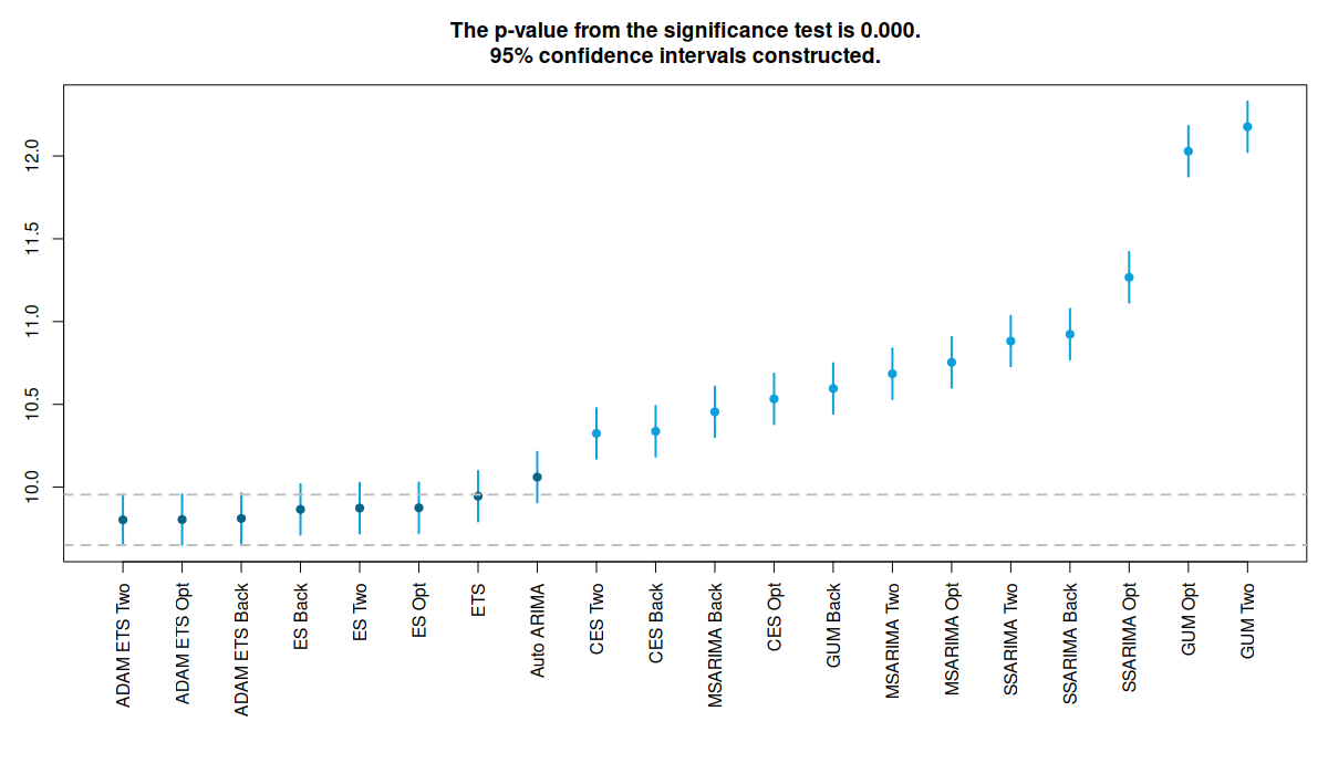 The image shows mean ranks for each of the models and whether the performance of those is significant on the 5% level or not. It is apparent that ADAM ETS has the lowest rank, no matter what the initialisation is used, but its performance does not differ significantly from the es(), ets() and auto.arima(). Also, auto.arima() significantly outperforms msarima() and ssarima() on this data, which could be due to their initialisation. Still, backcasting seems to help all the functions in terms of accuracy in comparison with the "optimal" and "two-stage" initials.