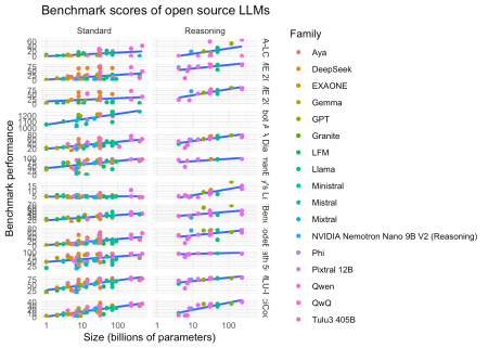 ggplot( scoreboard |> filter(!is.na(Parameters)) |> pivot_longer( starts_with("Intelligence::"), names_to = "Benchmark", values_to = "Score" ) |> mutate(Benchmark = str_replace(Benchmark, "Intelligence::", "")) ) + aes( x = Parameters, y = Score, colour = Family ) + facet_grid( rows = vars(Benchmark), cols = vars(Reasoning), scales = "free_y" ) + scale_x_log10() + geom_smooth( method = "lm", formula = y ~ x, se = FALSE, inherit.aes = FALSE, mapping = aes( x = Parameters, y = Score, ) ) + geom_point() + labs( title = "Benchmark scores of open source LLMs", x = "Size (billions of parameters)", y = "Benchmark performance" ) + theme_minimal()