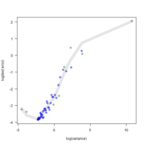 pch=19, xlab="log(variance)", ylab="log(test error)",
