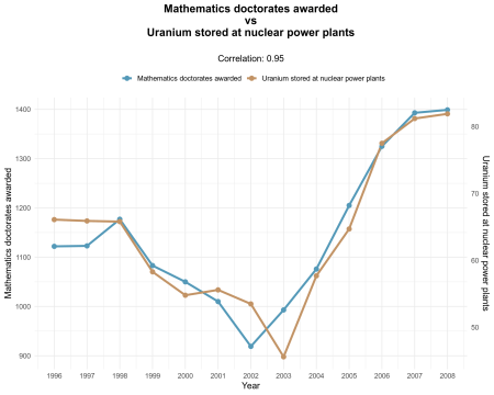 engineering_doctorates <- filter(spurious_correlations, var2_short == "Engineering doctorates") cor_val <- cor(engineering_doctorates$var1_value, engineering_doctorates$var2_value) v1 <- engineering_doctorates$var1_value v2 <- engineering_doctorates$var2_value adjust <- fun_adjust(v1, v2) scale_a <- adjust["a"] scale_b <- adjust["b"] y1_title <- as.character(unique(engineering_doctorates$var1)) y2_title <- as.character(unique(engineering_doctorates$var2)) engineering_doctorates_long <- engineering_doctorates %>% select(year, var1_value, var2_value) %>% pivot_longer( cols = c(var1_value, var2_value), names_to = "variable", values_to = "value" ) %>% mutate( variable_label = case_when( variable == "var1_value" ~ y1_title, variable == "var2_value" ~ y2_title ), # apply transform to var2 for plotting: plot_value = a * var2 + b plot_value = ifelse(variable == "var2_value", value * scale_a + scale_b, value) ) # make a double y axis plot with year on the x axis ggplot(engineering_doctorates_long, aes(x = year)) + geom_line(aes(y = plot_value, color = variable_label, group = variable_label), linewidth = 1.5) + geom_point(aes(y = plot_value, color = variable_label), size = 3) + labs( x = "Year", y = y1_title, title = sprintf("%s\nvs\n%s\n", y1_title, y2_title), subtitle = sprintf("Correlation: %.2f", cor_val), color = "" ) + # display all years on the x axis scale_x_continuous(breaks = nic_cage$year) + # primary y axis is the var1 scale # secondary shows var2 original scale by inverse-transforming scale_y_continuous( sec.axis = sec_axis(~ (. - scale_b) / scale_a, name = y2_title) ) + theme_minimal(base_size = 13) + theme(legend.position = "top") + # use tintin color palette scale_colour_manual( values = tintin_pal(option = "the black island")(2), name = "" ) + # center title and subtitle theme( plot.title = element_text(hjust = 0.5, size = 16, face = "bold"), plot.subtitle = element_text(hjust = 0.5) )