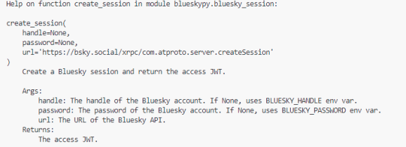 """Bluesky session management module""" import requests def create_session( handle=None, password=None, url="https://bsky.social/xrpc/com.atproto.server.createSession", ): """Create a Bluesky session and return the access JWT. Args: handle: The Bluesky handle (if None, uses BLUESKY_HANDLE env var). password: The password (if None, uses BLUESKY_PASSWORD env var). url: The Bluesky API URL. Returns: The access JWT. """ # ... code ... return "access_jwt"
